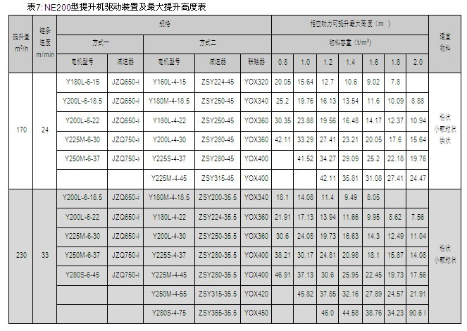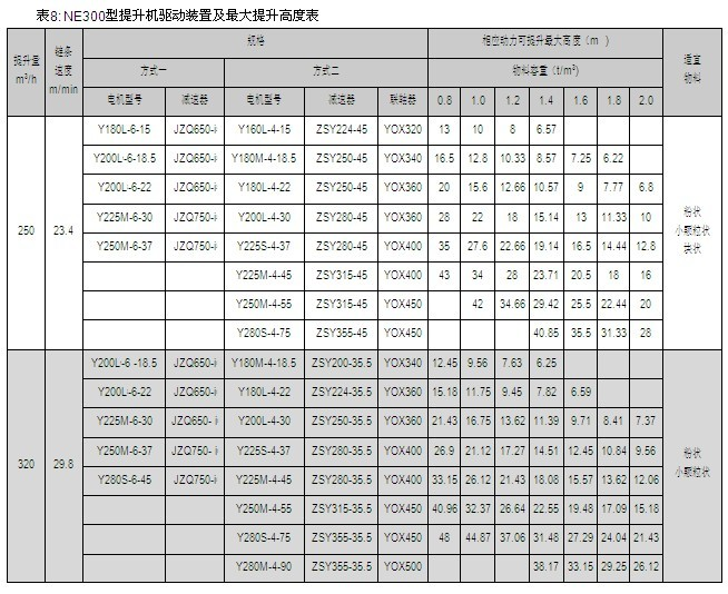 NE15、NE30、NE50、NE100、NE150、NE200、NE300、NE400型提升機(jī)的提升量上限、提升高度上限及動(dòng)力配備表見(jiàn)表2~9,選擇NE500、NE600、NE800型提升機(jī)時(shí),請(qǐng)與本公司技術(shù)部聯(lián)系。