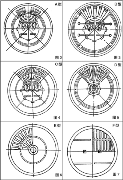 A型和B型排列(見(jiàn)圖1、圖2)適用于Φ12m以下的水泥或生料混合式均化庫(kù),環(huán)形區(qū)充氣箱向中心區(qū)傾斜安裝,中心區(qū)充氣箱水平安裝。