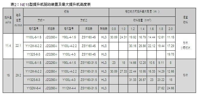 NE15、NE30、NE50、NE100、NE150、NE200、NE300、NE400型提升機(jī)的提升量上限、提升高度上限及動(dòng)力配備表見(jiàn)表2~9,選擇NE500、NE600、NE800型提升機(jī)時(shí),請(qǐng)與本公司技術(shù)部聯(lián)系。